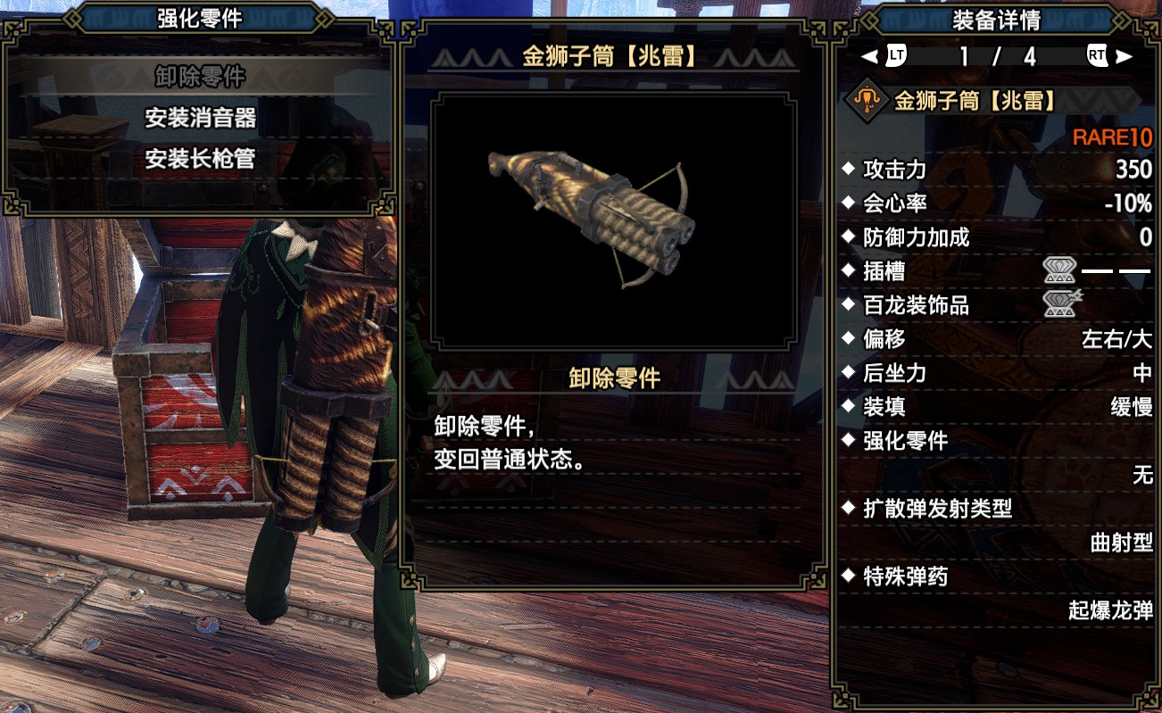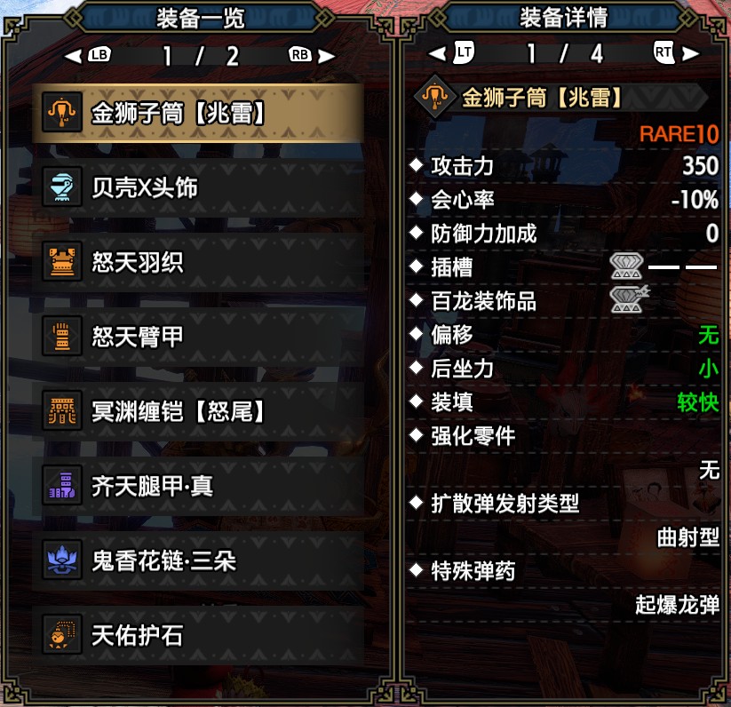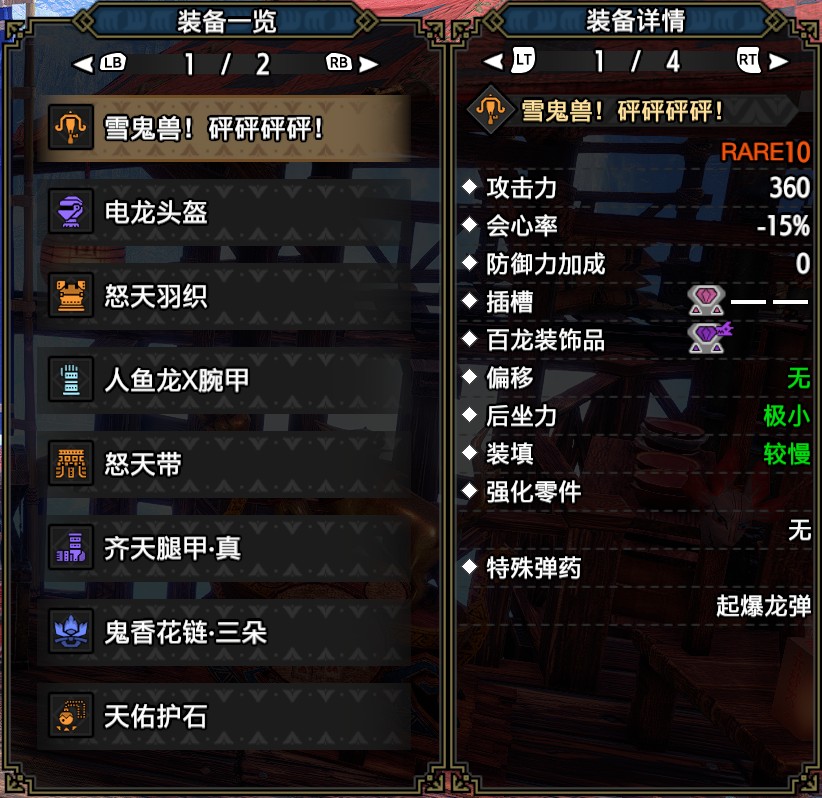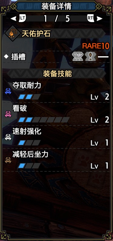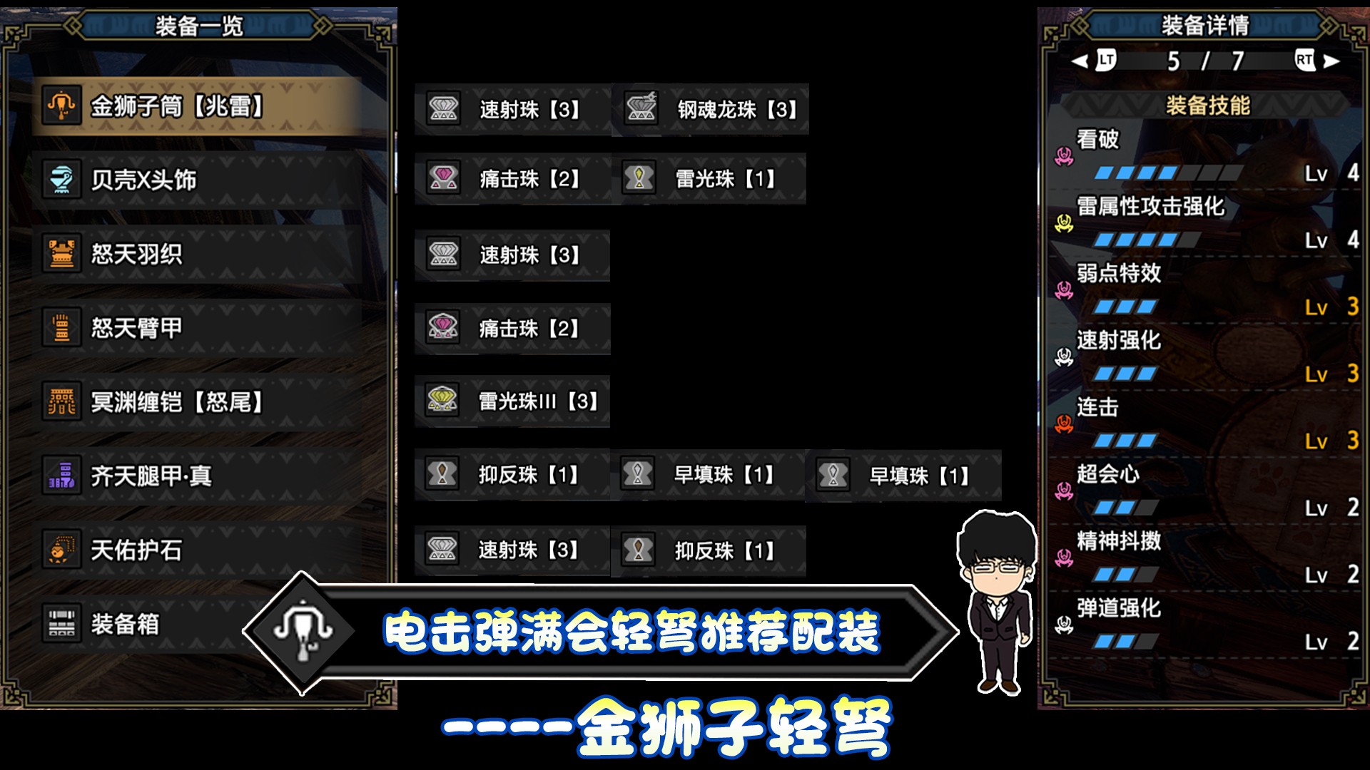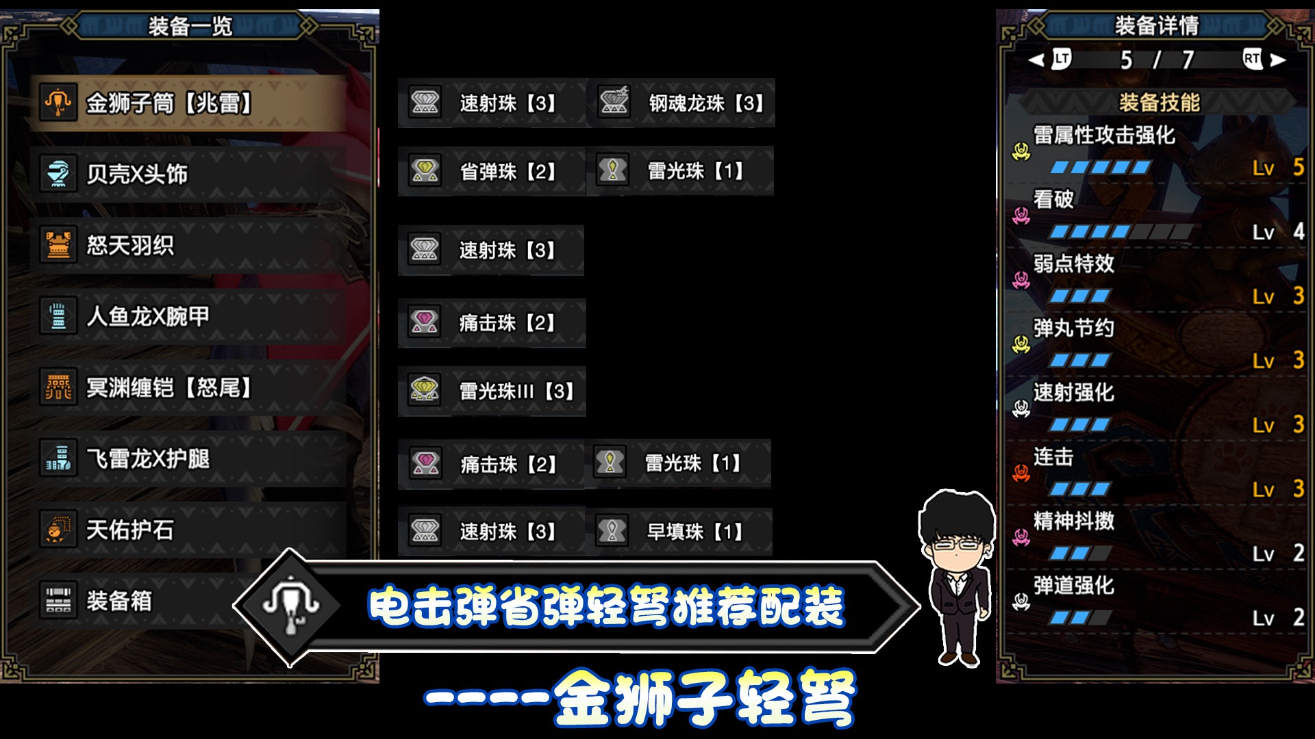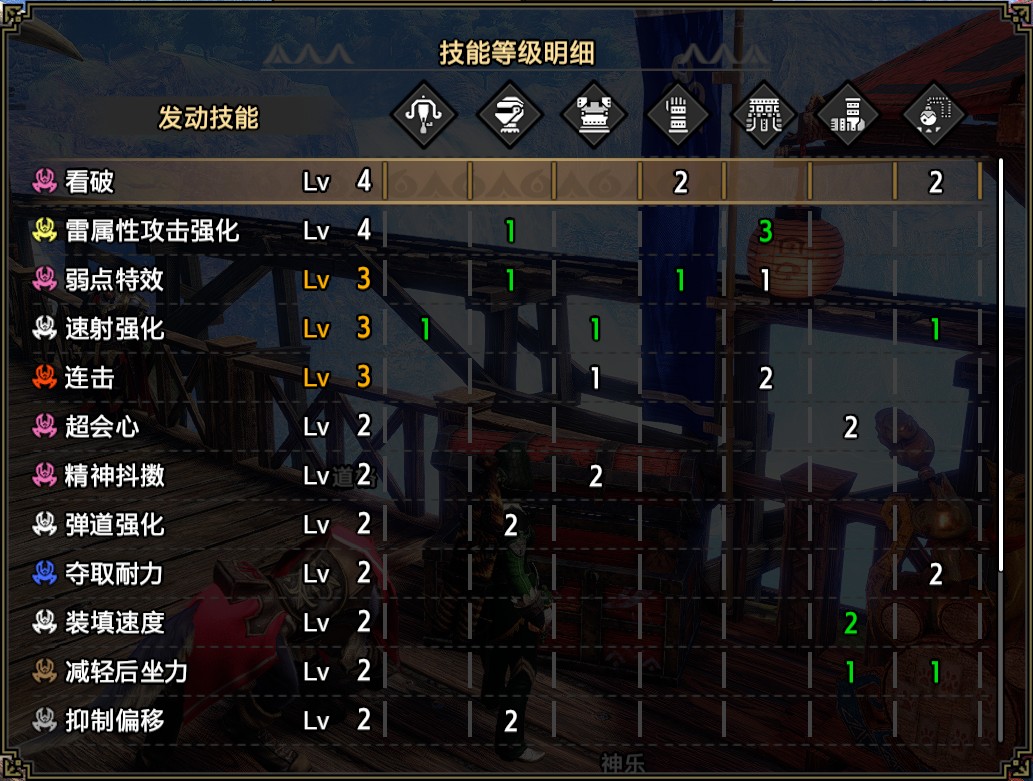 技能:看破4,雷属性4,弱点特效3,速射强化3,连击3,超会心2,精神抖擞2,弹道强化2,夺取耐力2,装填速度2,减轻后坐力2,抑制偏移2,减轻胆怯2,力量解放1,回避距离提升1,激昂1,零件改造1