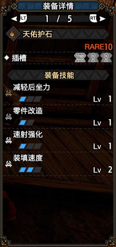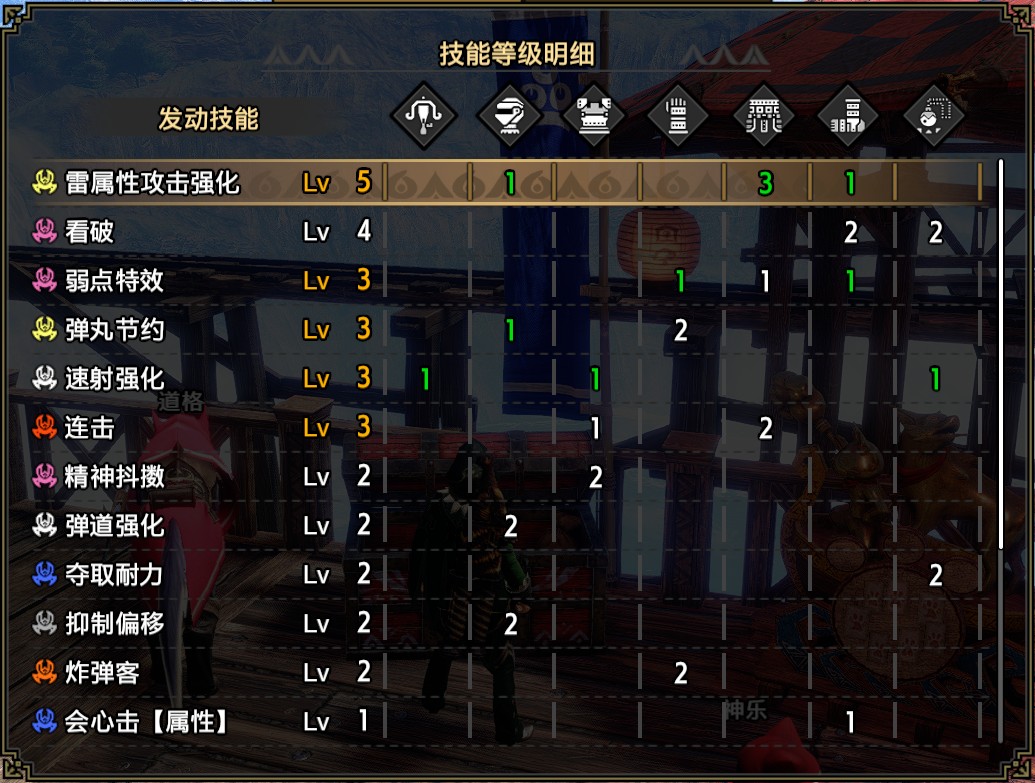 技能:雷属性5,看破4,弱点特效3,弹丸节约3,速射强化3,连击3,精神抖擞2,弹道强化2,夺取耐力2,抑制偏移2,炸弹客2,会心击【属性】1,匠1,体术1,装填速度1,精灵加护1,回避距离提升1,零件改造1