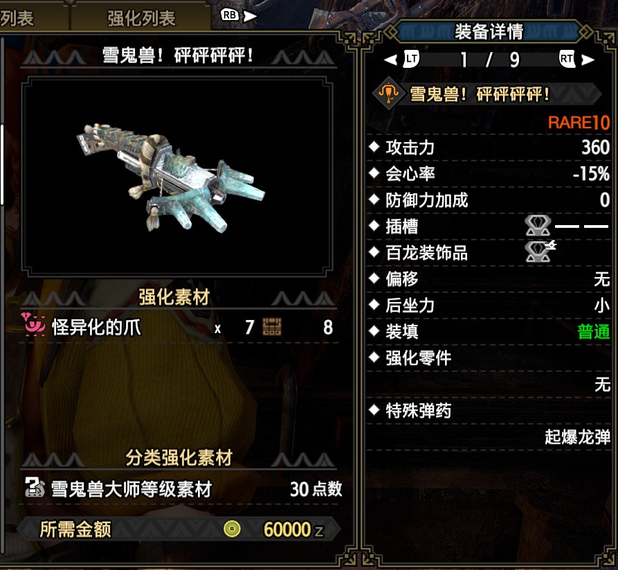 技能:冰属性4,弱点特效3,弹丸节约3,装填速度3,速射强化3,连击3,超会心2,精神抖擞2,会心击【属性】2,抑制偏移2,昏厥耐性2,炸弹客2,减轻胆怯2,力量解放1,匠1,利刃1,减轻后坐力1,精灵加护1,回避距离提升1,零件改造1