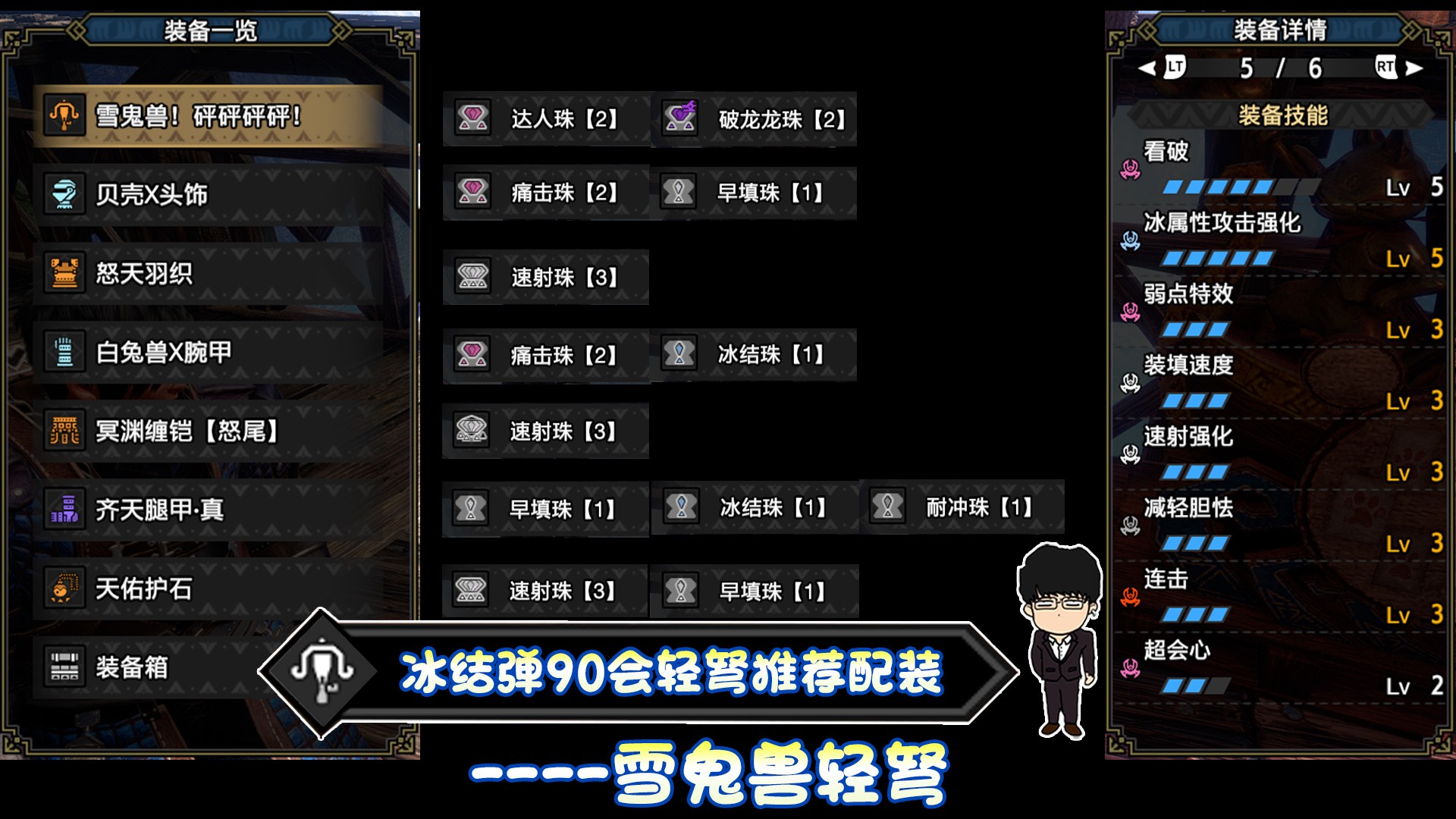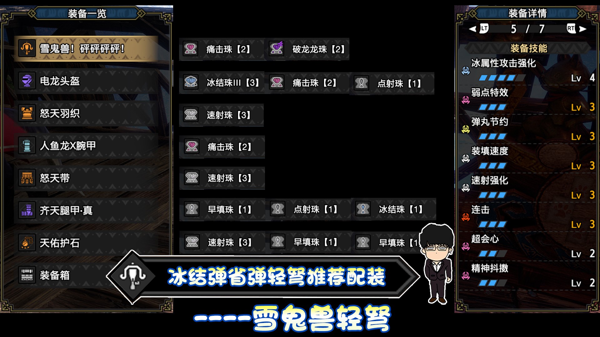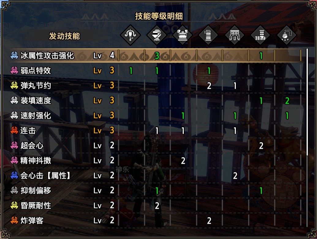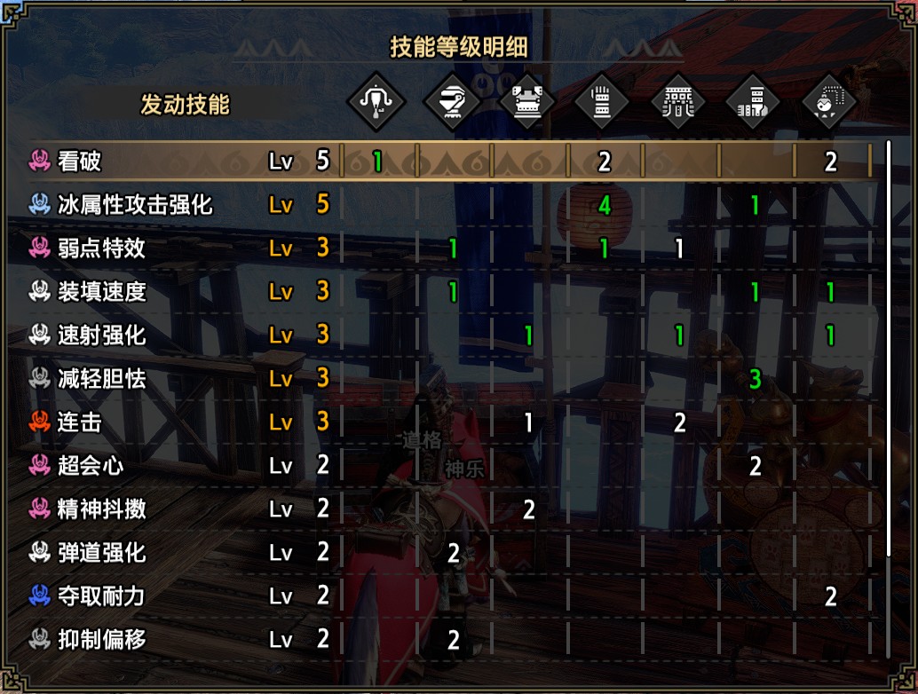 技能:看破5,冰属性5,弱点特效3,装填速度3,速射强化3,减轻胆怯3,连击3,超会心2,精神抖擞2,弹道强化2,夺取耐力2,抑制偏移2,力量解放1,回避距离提升1,零件改造1