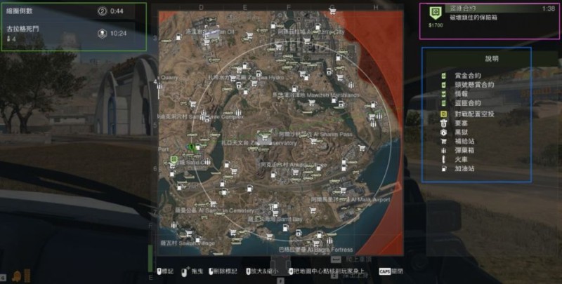合约:玩家在地图上可以收集和进行合约任务,在规定时间内完成合约任务能获得物资和枪械经验或其他奖励,比如知道下一个圈缩在哪里。