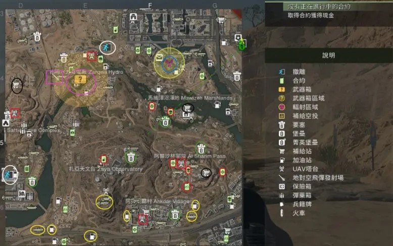 红色圆圈:合约任务,在战局内进行的任务,完成会获得现金和其他奖励,从运送载具再到破坏物资箱不等。