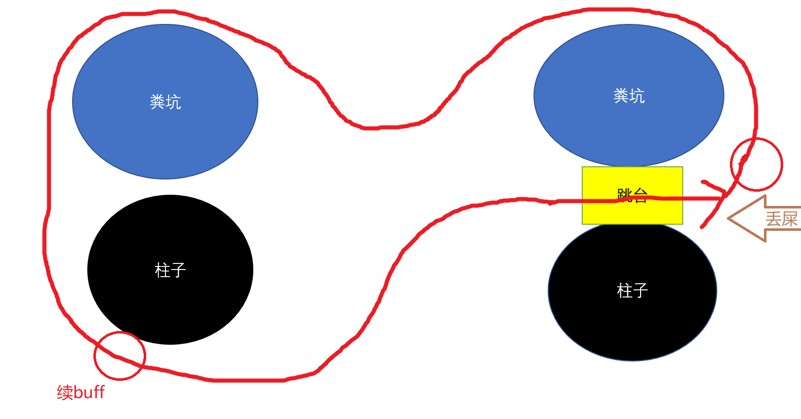 注意续buff的操作为可选选项,在这里续buff也是为了尽可能让三个人站在一块,提高丢屎效率。