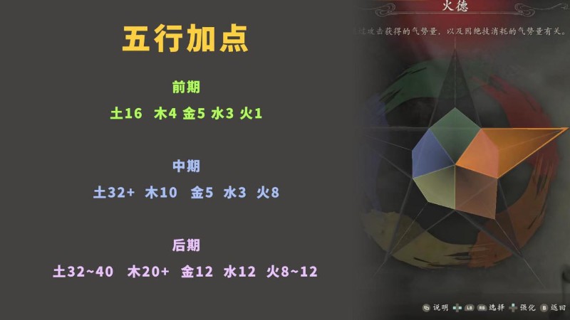 进入游戏中期,由于土德够高,全身重甲也可到达B敏,降低了我们闪避的气势消耗,此时可以逐渐以闪避替代格挡,配合奇术抵挡五行伤害,不仅生存能力有提升,闪避有时所触发的化解使得气势条也不在像之前那么紧张,我们有更多的机会使用势气攻击。当击败孙坚获得古锭刀后,用用古锭刀的绝技替代气势攻击,只要有一丝正气势我们就可以选择使用此绝技,其他时候也可用强甲术配合奇术附魔所打出的轻攻击来贪刀。