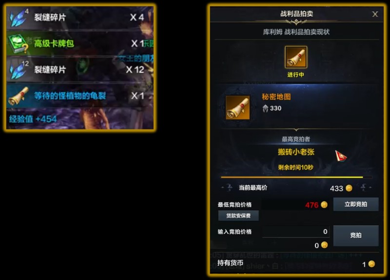 参与击杀小BOSS奖励随机数量的裂缝碎片,参与击杀最后的守关BOSS奖励为一张随机品质秘密地图,一颗随机品质卡牌包以及若干裂缝碎片组成。且会在有一张固定传说级(金色)品质的秘密地图进行拍卖,该拍卖价高者得,其余参与击杀该BOSS的玩家进行分红。