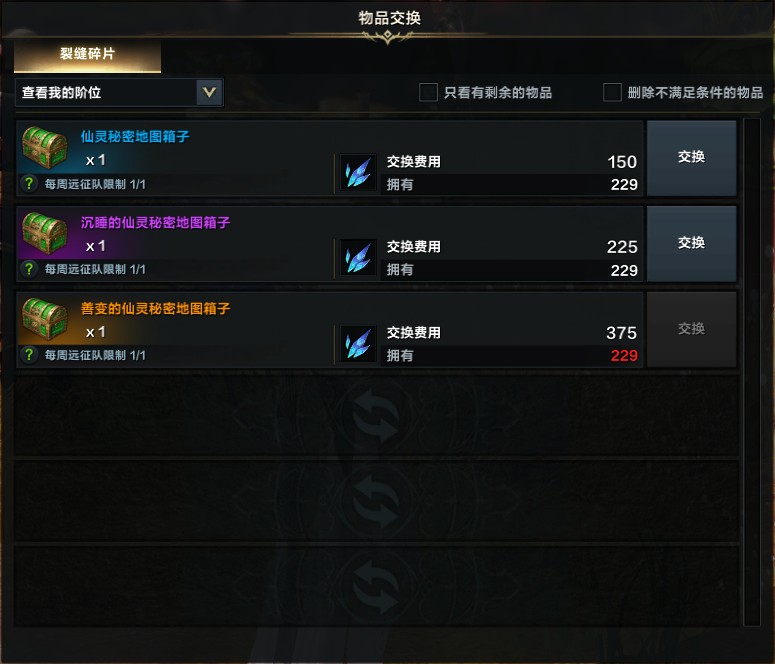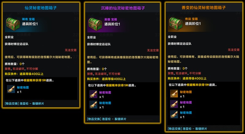 这里你可以将自己没挖的低级图通过兑换的方式提升为高级图(概率),每次最少放进两张,但放进去的当作材料的秘密地图越多,提升成功的概率越高,如果成功,则获得下一级别的秘密地图,如果失败则维持原状,但无论结果是什么,被当作提升概率材料的秘密地图都会消失。