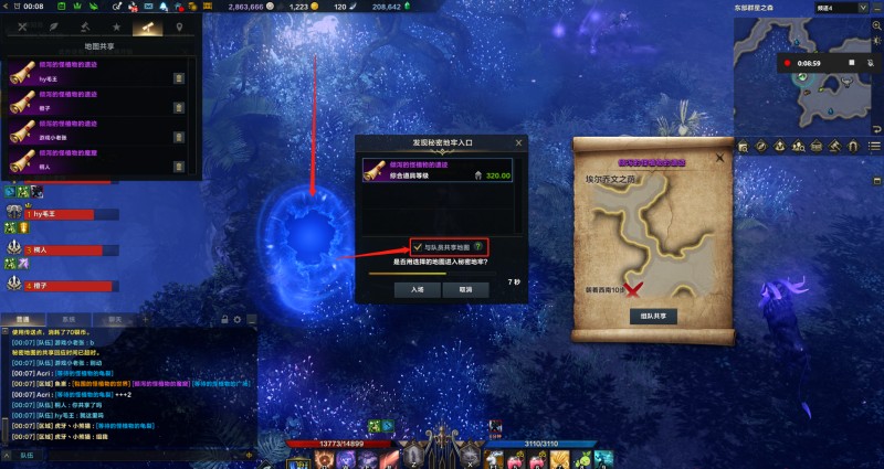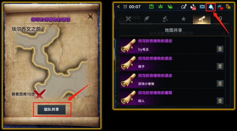 人员配置齐全后(4人)你可以点击秘密地图中的组队共享,让其他玩家接受你的秘密地图共享,并看到你的秘密地图地点,这样方便查看4人当中谁的藏宝点最容易找到,这样可以节省大量的时间。共享后的秘密地图,可以在屏幕最上面的铃铛图标处点开查看。