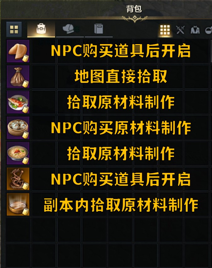 分为直接获取和获取原材料再去制作两种方式。部分特别的料理需要靠运气去开启道具