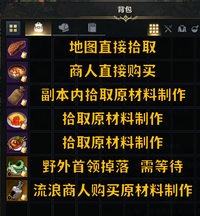 分为直接获取和获取原材料再去制作两种方式,另外有一个特殊的料理需要这里的区域BOSS爆出。