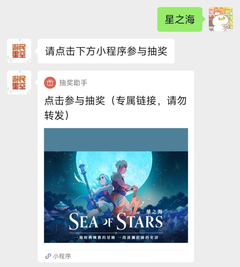 微信搜索“游民星空”,或扫描下方二维码,关注游民星空公众号,私信回复【星之海】,根据出现的小程序引导,即可参与抽奖活动。