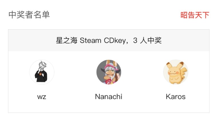 恭喜微信昵称为“wz”、“Nanachi”和“Karos”的游民老哥中奖,已经在微信平台发过通知啦,请注意及时查收哦~