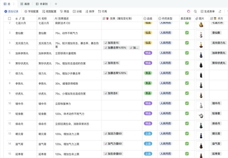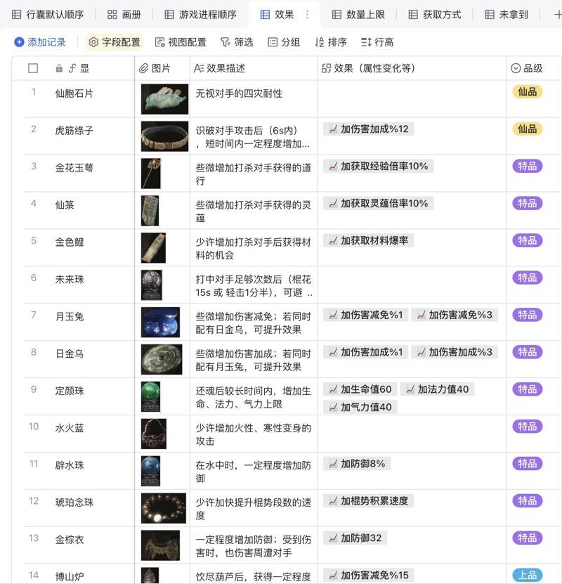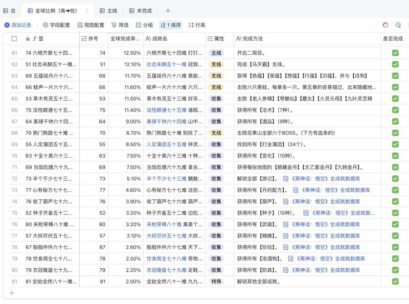 在完成全成就的过程中,为了效率,做了个数据库系统 + 梳理,感谢 ChatGPT & Claude帮忙提效,分享给各位天命人,翻着回味(剧透标志,包括所有成就、游记、影神图、珍玩、精魄、葫芦、酒、泡酒物、丹药、武器、防具等等)。